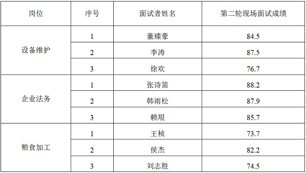 根據(jù)寧波市糧食收儲有限公司2024年校園招聘計劃,通過網(wǎng)上報名、資格審查、第一輪網(wǎng)絡(luò)面試,有九名人員進入第二輪現(xiàn)場面試,現(xiàn)將現(xiàn)場面試成績公示如下:
